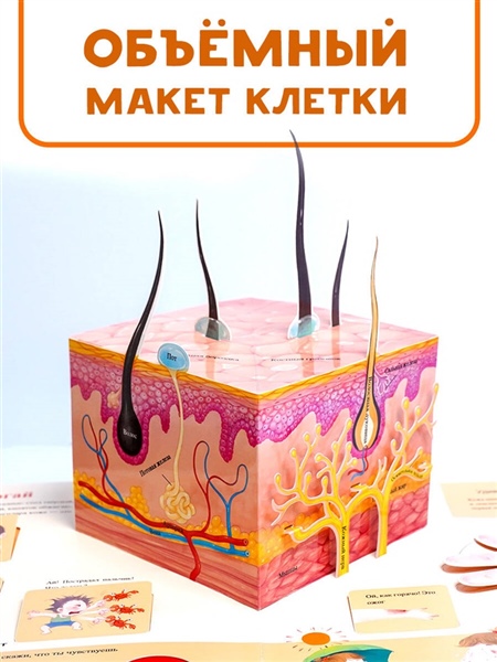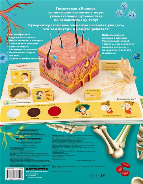 Это лучшая детская книга по анатомии — гигантская 3D-книга, не имеющая аналогов в мире: увлекательное путешествие по человеческому телу в интерактивном формате. Здесь есть всё! Суперинтерактивные элементы позволят увидеть, что там внутри и как это работает: разнообразные подвижные детали, много окошек и створок, тактильные вставки, всплывающие объемные картинки, подвижная модель скелета, удобный набор магнитов, информативная книжка в книжке, уникальный способ увидеть, как действует нервная система, — достаточно простого фонарика! Все ответы на вопросы детей о теле и прекрасный подарок для маленьких почемучек.