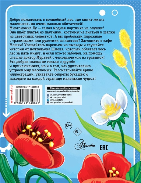 Добро пожаловать в лес, где шьют платья из паутинки и пекут пирожные из травинок. Вы познакомитесь с жителями леса и узнаете секреты обаятельных букашек. Яркая, добрая сказка с историями про насекомых — для маленьких исследователей и больших фантазёров!