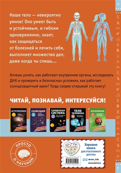 С этой книгой ты узнаешь всё о том, как работает наше тело: как оно растёт и развивается, из чего состоят наши внутренние органы, как организм умеет защищаться от болезней – и как ему нужно в этом помогать. Словарь и алфавитный указатель в конце книги помогут тебе ещё лучше разобраться в анатомии человека – узнай, как по-научному называются части нашего тела. А ещё тебя ждут увлекательные опыты, с которыми ты станешь настоящим исследователем!