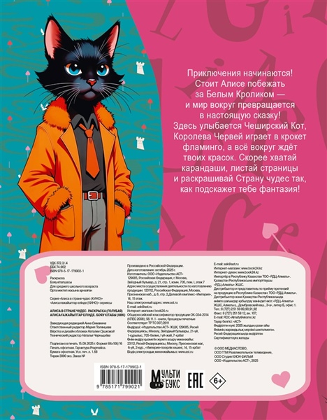Приключения начинаются! Стоит Алисе побежать за Белым Кроликом — и мир вокруг превращается в настоящую сказку! Здесь улыбается Чеширский Кот, Королева Червей играет в крокет фламинго, а всё вокруг ждёт твоих красок. Скорее хватай карандаши, листай страницы и раскрашивай Страну чудес так, как подскажет тебе фантазия!