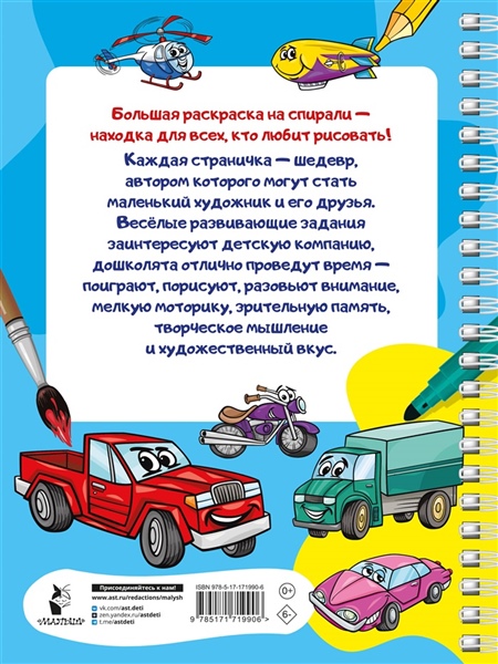 "100 автомобилей, самолётов, кораблей. Большая раскраска для мальчиков" — шедевр, автором которого могут стать маленький художник и его друзья. Книга на спирали идеальна для рисования и раскрашивания. Заниматься очень удобно — благодаря спирали страницы раскраски легко перекидываются из стороны в сторону, открываясь на 360 градусов. Эта книга должна быть у каждого мальчишки. Так здорово делать яркими и красочными автомобильные трассы, корабли в бушующем море, самолёты под облаками — раскрашивать можно цветными карандашами, фломастерами, маркерами, линерами, мелками, выбирая цвета и оттенки для каждого рисунка. Простые и интересные развивающие задания заинтересуют дошколят, помогут развить трудолюбие, собранность и упорство — ведь нужно приложить усилия, чтобы страница раскраски превратилась в законченную работу. Для дошкольного возраста.