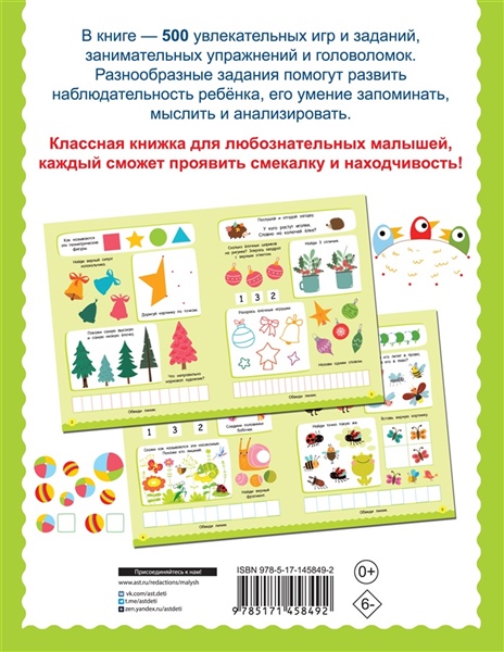"500 увлекательных заданий для малышей 3–5 лет" — много-много развивающих игр, которые помогут ребёнку научиться мыслить нестандартно, развить аналитическое мышление, речь, внимание, память, графические навыки, мелкую моторику.В нашей книжке интеллектуальных игр и заданий — ни одной скучной страницы!