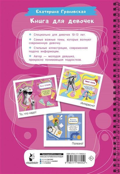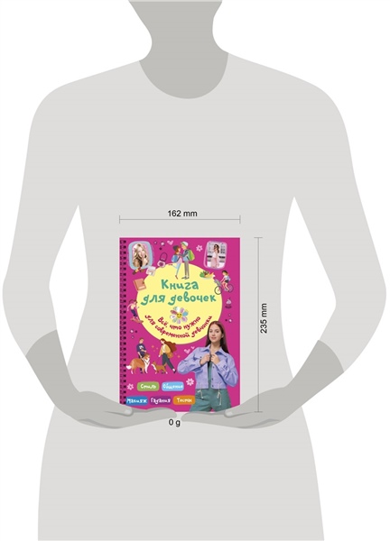 "Книга для девочек. Всё, что нужно для современной девчонки" создана специально для подростков 10-13 лет и содержит разделы о красоте и стиле, общении, лидерских качествах, диалоге с родителями, питании, гигиене, финансовой грамотности, безопасности в интернете и многом-многом другом. Книга удобна и практична — благодаря спирали страницы легко перекидываются из стороны в сторону, открываясь на 360 градусов. Для среднего школьного возраста.