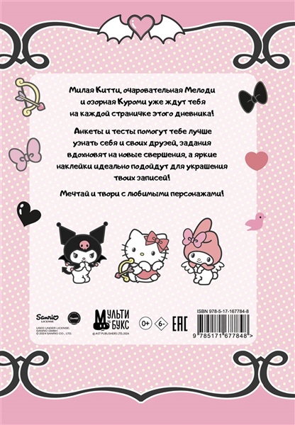 Милая Китти, очаровательная Мелоди и озорная Куроми уже ждут тебя на каждой страничке этого дневника! Анкеты и тесты помогут тебе лучше узнать себя и своих друзей, задания вдохновят на новые свершения, а яркие наклейки идеально подойдут для украшения твоих записей! Мечтай и твори с любимыми персонажами!