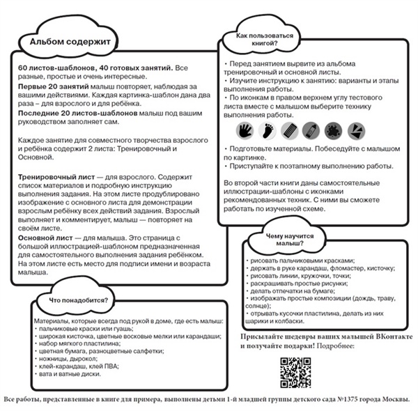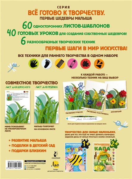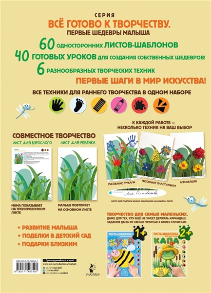 Альбом для совместного творчества мамы и малыша. Готовые шаблоны для поделок и раскрашивания.Каждый арт-лист — это красочная картинка-заготовка, которую нужно творчески доработать.В альбоме 60 арт-листов и 40 готовых занятий. К каждому занятию дан ЛИСТ ДЛЯ МАМЫ с инструкцией, картинкой для тренировки, советами по предварительной беседе с малышом, описанием материалов и техники выполнения работы. И ЛИСТ ДЛЯ МАЛЫША с большой картинкой для творчества.В пособии собраны все развивающие творческие техники для самых маленьких: простая аппликация, рисование ладошками, ножками, пластилином, пальчиками, кисточкой и восковыми мелками.Каждый лист легко отрывается от блока и запечатан только с одной стороны — законченная работа не слипнется со следующими страницами, а краска и пятна от пластилина на обороте работы не испортят других изображений.На каждом арт-листе есть место для подписи имени и возраста маленького художника — шедевры малыша можно дарить родным и друзьям, относить в детский сад на конкурс поделок или украшать стены дома!Задания разработаны и нарисованы профессиональными художниками с учётом психофизических особенностей малыша — с художественной задачей справится даже самый маленький ребёнок.