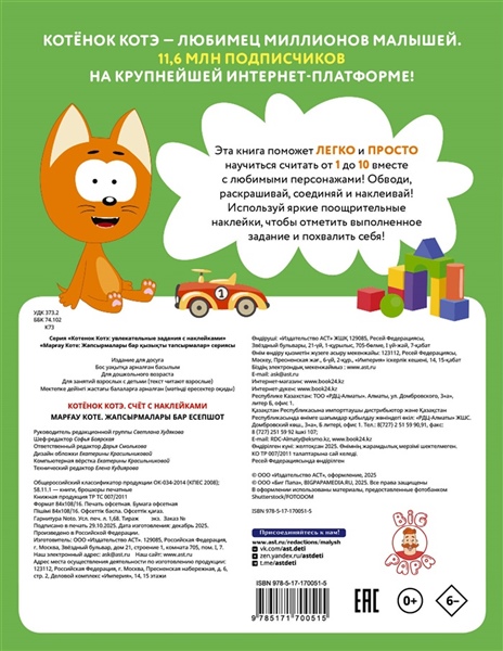 Котёнок Котэ — любимец миллионов малышей. 11,6 млн подписчиков на крупнейшей интернет-платформе! Эта книга поможет ЛЕГКО и ПРОСТО научиться считать от 1 до 10 вместе с любимыми персонажами! Обводи, раскрашивай, соединяй и наклеивай! Используй яркие поощрительные наклейки, чтобы отметить выполненное задание и похвалить себя!