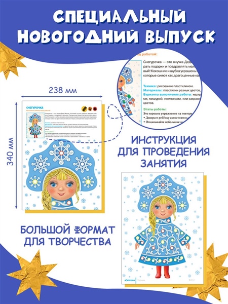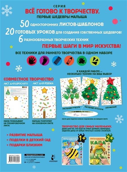 Новый год! Много праздничных дней в кругу семьи, атмосфера творчества и волшебства и, конечно, подарки близким! А что может быть теплее, чем подарок, созданный руками ребёнка?! Он согреет душу близких вам людей и долгие годы будет трогательным свидетельством первых шагов вашего малыша в мире искусства. Подарочный альбом "Жужа и Капа встречают Новый год" — это готовые новогодние шаблоны для поделок и раскрашивания. Каждое задание снабжено коротким простым текстом беседы с ребёнком — ваш малыш узнает о национальных персонажах и традициях праздника: кто такие Снегурочка и Дед Мороз, что такое куранты, гирлянда, фейерверк, чем отличаются ёлка и сосна, какая бывает зимняя одежда, какие блюда и сладости традиционно готовят на Новый год в нашей стране... Пособие экономит ваше время и превращает урок творчества в удовольствие. С помощью этой книги вы сможете сделать с малышом более 20 новогодних шедевров. В альбоме всё готово для совместного творчества мамы и малыша: красивые и простые для исполнения сюжеты, специальные ЛИСТЫ ДЛЯ МАМЫ с инструкцией, картинкой для тренировки, советами по предварительной беседе с малышом, описанием материалов и техники выполнения работы. На ЛИСТЕ МАЛЫША — большая картинка-шаблон, которую он сможет без труда самостоятельно превратить в новогодний рисунок. В пособии собраны все развивающие творческие техники для самых маленьких: простая аппликация, рисование ладошками, ножками, пластилином, пальчиками, кисточкой и восковыми мелками. Каждый лист легко отрывается от блока и запечатан только с одной стороны — законченная работа не слипнется со следующими страницами, а краска и пятна от пластилина на обороте работы не испортят других изображений. На каждом арт-листе есть место для подписи имени и возраста маленького художника — шедевры малыша можно дарить родным и друзьям, относить в детский сад на конкурс поделок или украшать стены дома! Задания разработаны и нарисованы профессиональными художниками с учётом психофизических особенностей малыша — с художественной задачей справится даже самый маленький ребёнок.