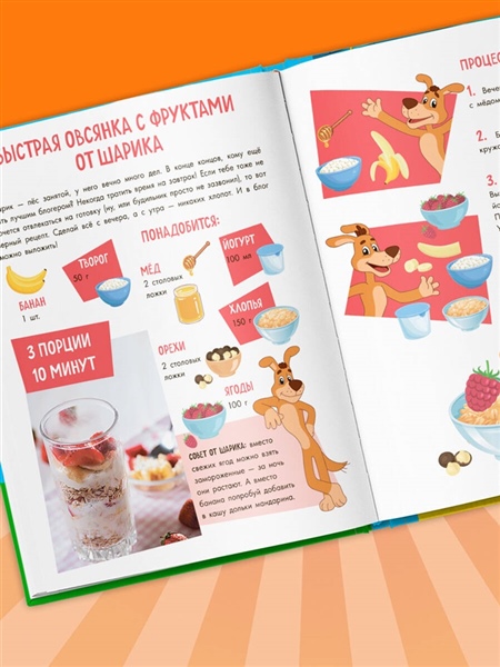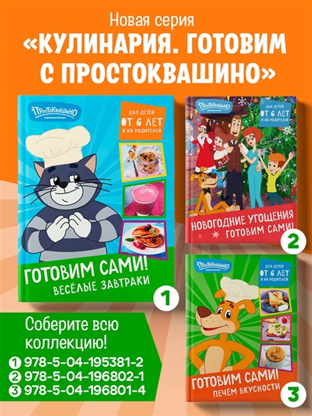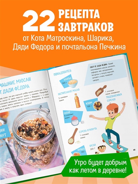 Ваш ребенок постоянно крутится на кухне и то и дело хочет помочь вам в готовке? А может, он уже жарит яичницу, как заправский повар? Пора расширять умения! Вместе с любимыми героями мультсериала «Простоквашино» ребята научатся готовить яркие вкусные завтраки: от самых простых, вроде «ленивой» ночной овсянки, до необычных, например печеных яблок с орехами. От старших понадобится только пару раз помочь, чтобы ребенок подружился с духовкой. В книге ждут 22 проверенных рецепта, с которыми справится любой ребенок, а Матроскин, Шарик, Дядя Федор и другие герои будут помогать ему во время процесса. Нежная рисовая каша с ягодами, сэндвич с овощами и курицей, красивый омлет фриттата — такие завтраки понравятся не только ребятам, но и всей семье!