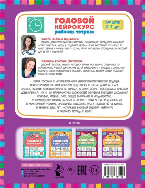Батяева Светлана Вадимовна Логопед-дефектолог высшей категории, сурдопедагог, победитель конкурсов "Грант Москвы", "Сердце, отданное детям", грант Выготского 2013–2020 гг.,имеет звание "Учитель года – 2010", автор множества логопедических пособий для детей и родителей. Хомякова Кристина Викторовна Детский психолог, эксперт методики Марии Монтессори, специалист по нейропсихологической диагностике детей дошкольного и младшего школьного возраста, автор развивающих пособий, основатель детской студии "Малыш", мама четверых детей. Серия пособий с использованием нейропсихологического подхода ориентирована на комплексную подготовку к школе детей 6-7 лет. Данные пособия ориентированы не только на закрепление необходимых навыков дошкольника, но и на профилактику сложностей обучения будущего школьника (письмо, чтение, счёт, общее внимание и усидчивость). Рекомендуется начать занятия в возрасте пяти лет и продолжать их в комфортном режиме, занимаясь несколько раз в неделю по 15 минут, в течение двух лет, используя базовый годовой нейрокурс и рабочую тетрадь к нему.
