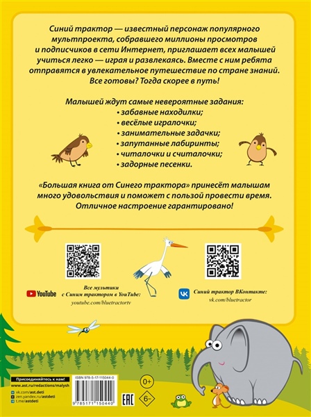 Все малыши в восторге от Синего трактора — главного героя развивающего мультпроекта, популярного в сети Интернет. В этой книге Синий трактор предлагает тебе не только выполнить занимательные задания, но и спеть вместе с ним весёлые песенки. А ещё в ней можно рисовать —для этого здесь есть большие раскраски, которые любят все дети. Счет и алфавит, животные и птицы, овощи и фрукты, лабиринты и задачки — все это и многое другое ждет юных читателей на страницах"Большой книги от Синего трактора".Для дошкольного возраста.