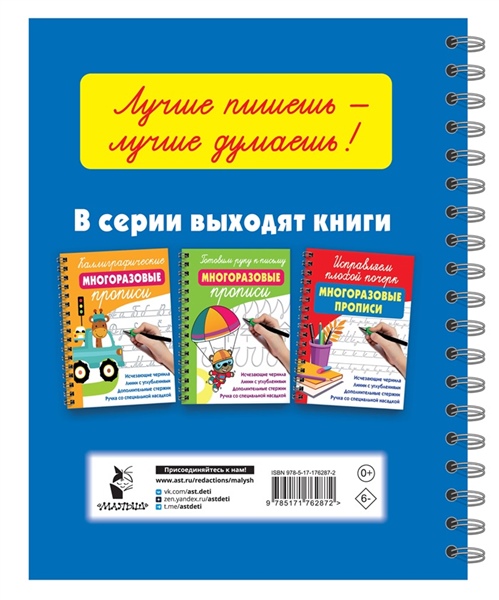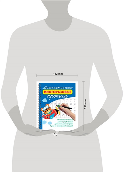 "Математические многоразовые прописи" — это волшебная книга с трафаретными цифрами и числами, которые помогут будущим школьникам научиться писать красивым почерком. В наборе — ручка, 10 запасных стержней с ичезающими чернилами и насадка для правильного формирования почерка. Можно тренироваться хоть тысячу раз! Также в книге есть множество весёлых заданий: лабиринты, головоломки, игры на внимательность и многое-многое другое!