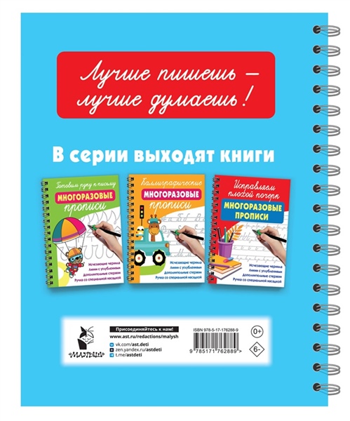 "Учимся писать буквы: многоразовые прописи" — это волшебная книга с трафаретными печатными буквами, которые помогут будущим школьникам научиться писать красивым почерком. В наборе — ручка, 10 запасных стержней с ичезающими чернилами и насадка для правильного формирования почерка. Можно тренироваться хоть тысячу раз! Также в книге есть множество весёлых заданий: лабиринты, головоломки, игры на внимательность и многое-многое другое!