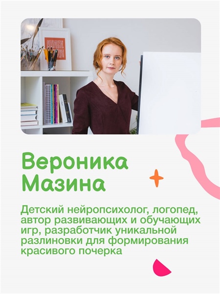 Вероника Мазина – детский нейропсихолог, логопед, автор развивающих и обучающих игр, разработчик уникальной разлиновки для формирования красивого почерка, основатель курсов обучения специалистов и родителей для эффективной помощи детям.