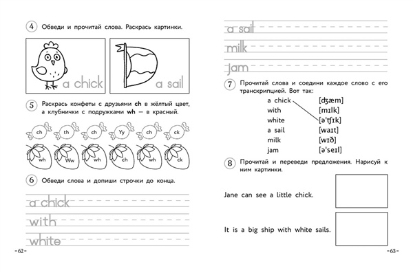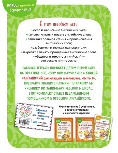 У ребенка в школе начался английский, и родители хватаются за голову? Учитель и учебник не учат читать, и невозможно даже выполнить домашнее задание? Школьники не успевают за программой, потому что не владеют основами? С «Английским для младших школьников» ваш ребенок познакомится с английскими буквами и звуками, разберется в их произношении, освоит правила чтения английского языка, запомнит множество полезных слов, научится строить простые предложения и овладеет основами грамматики. Рабочая тетрадь к пособию «Английский для младших школьников. Часть 1» — это возможность потренироваться в написании и использовании слов и букв, усвоить их произношение и научиться понимать значки транскрипции. По какому бы учебнику ни занимался ваш школьник, базовые знания по английскому языку помогут ему успешнее справляться с заданиями и лучше понимать материал на уроках. А главное — он приобретет реальные знания, которые непременно помогут получать отличные оценки и чувствовать себя уверенно и на уроках, и в путешествиях!