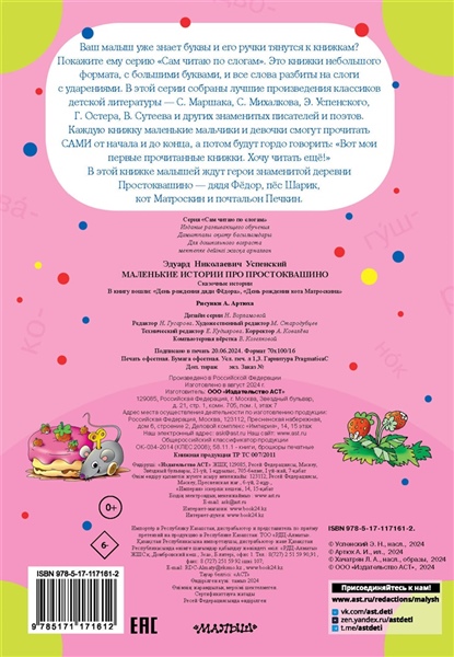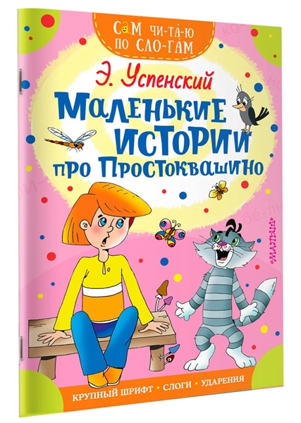 Ваш малыш уже знает буквы, и его ручки тянутся к книжкам? Дайте ему книжку из серии Сам читаю по слогам. Эти книжки небольшого формата, с большими буквами, и все слова разбиты на слоги с ударениями.В этой серии собраны лучшие произведения классиков детской литературыС. Маршака, С. Михалкова, Э. Успенского, Г. Остера, В. Сутеева и других знаменитых писателей и поэтов. Каждую книжку маленькие мальчики и девочки смогут прочитать САМИ от начала и до конца, а потом будут гордо говорить: Вот мои первые прочитанные книжки. Хочу читать ещ!В этой книжке малышей ждут герои знаменитой деревни Простоквашино - дядя Фдор, пс Шарик, кот Матроскин и почтальон Печкин.