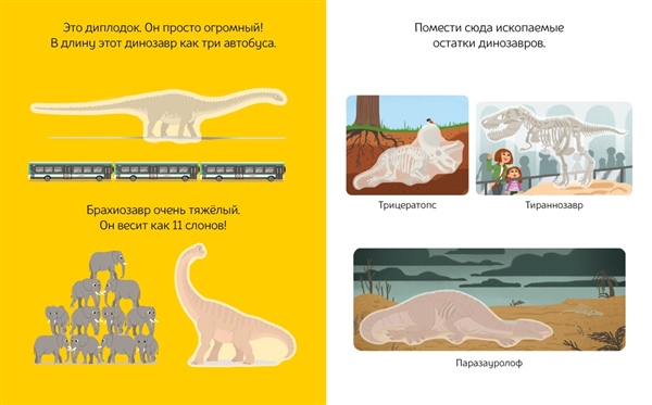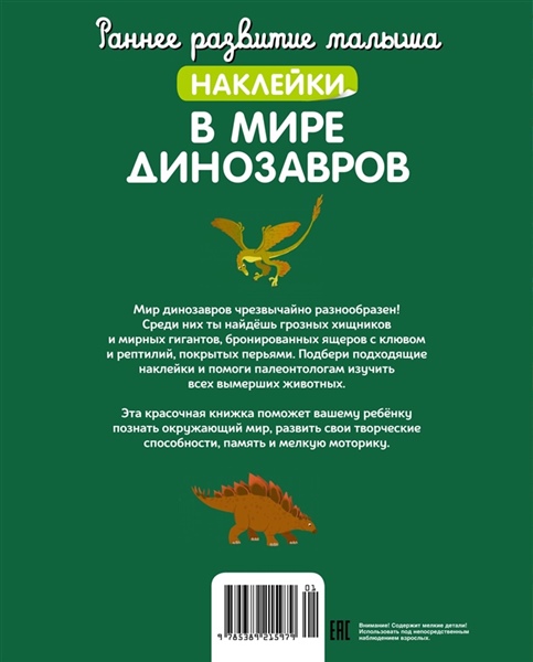 Мир динозавров чрезвычайно разнообразен! Среди них ты найдёшь грозных хищников и мирных гигантов, бронированных ящеров с клювом и рептилий, покрытых перьями. Подбери подходящие наклейки и помоги палеонтологам изучить всех вымерших животных. Эта красочная книжка поможет вашему ребёнку познать окружающий мир, развить свои творческие способности, память и мелкую моторику.