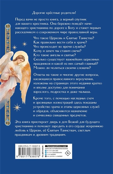 Эта книга призвана стать первым путеводителем для юного христианина, который ещё готовится войти в церковную жизнь. Она не только расскажет вашему крестнику о Боге и православной вере, церковных праздниках и связанных с ними народных традициях, но и научит, как правильно себя вести в храме, что следует делать во время Таинств и богослужения. На страницах издания кратко и понятно, в вопросах и ответах даны основы православного вероучения, с помощью наглядных схем и зрелищных иллюстраций показаны устройство храма и этапы церковных служб и обрядов, объясняются назначение и символика священных предметов. В этой книге вечные истины приоткрываются через простые слова и визуальные образы, но именно такие знания способны стать для вашего крестника тем духовным фундаментом, на котором будет строиться его дорога к Богу. Для широкого круга читателей.