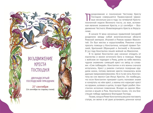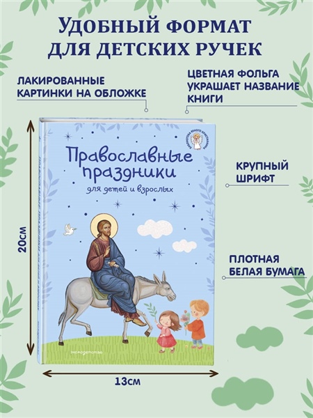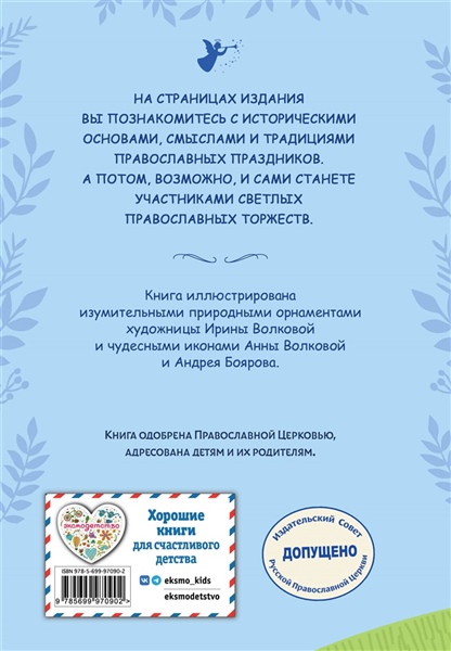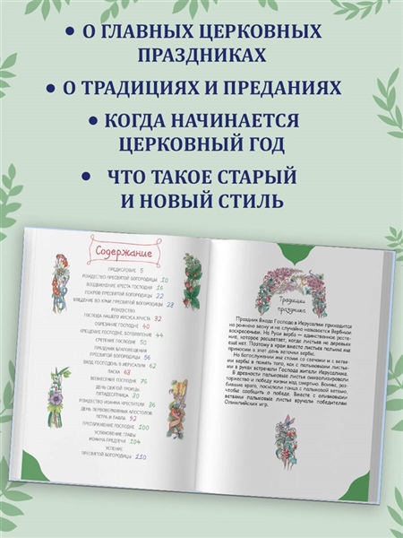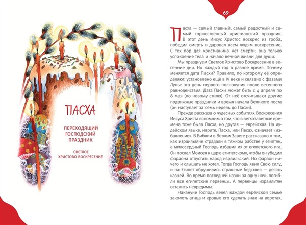 Одного просил я у Господа, того только ищу, чтобы пребывать мне в доме Господнем во все дни жизни моей, созерцать красоту Господню и посещать храм Его… Пс.26:4 Следуя событиям евангельской и церковной истории, христиане отмечают памятные дни, посвященные Иисусу Христу, Пресвятой Богородице и святым. В православных храмах совершаются праздничные богослужения: радостно и торжественно поёт хор, с хоругвями и иконами христиане идут крестным ходом вокруг церквей. Выузнаете о самых главных Великих церковных праздниках, традициях и преданияхПравославной Церкви. Когда начитается Церковный год, что такое старый и новый стиль. Книга празднично украшена природными орнаментами художницы Ирины Волковой и чудесными иконами Анны Волковой и Андрея Боярова. Книга адресована всем, кто интересуется православной культурой, хочет узнать как можно большеи возможно стать участником светлых православных торжеств.