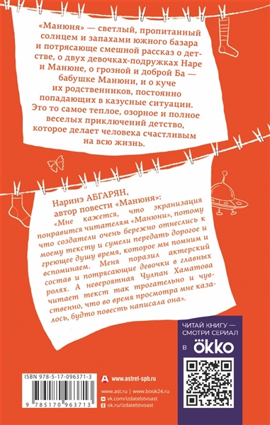 "Манюня" — светлый, пропитанный солнцем и запахами южного базара и потрясающе смешной рассказ о детстве, о двух девочках-подружках Наре и Манюне, о грозной и доброй Ба — бабушке Манюни, и о куче их родственников, постоянно попадающих в казусные ситуации. Это то самое теплое, озор­ное и полное веселых приключений детство, которое делает человека счастливым на всю жизнь.