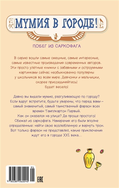 Давно вы видели мумию, разгуливающую по городу? Если вдруг встретите, будьте уверены, что перед вами – самый знаменитый, самый таинственный фараон всех времён Тамплкартон Первый. Как он оказался на улице? Да просто сбежал из саркофага! Намерения его были вполне определённые: найти свою возлюбленную и вернуть трон. Вот только фараон не представлял, какие приключения его ждут в городе XXI века…