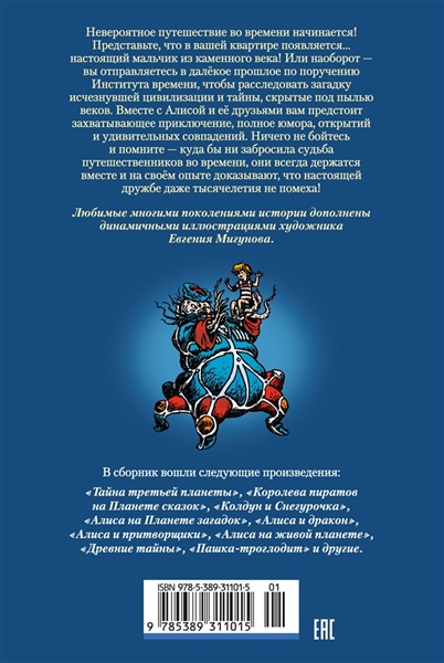 Невероятное путешествие во времени начинается! Представьте, что в вашей квартире появляется... настоящий мальчик из каменного века! Или наоборот — вы отправляетесь в далёкое прошлое по поручению Института времени, чтобы расследовать загадку исчезнувшей цивилизации и тайны, скрытые под пылью веков. Вместе с Алисой и её друзьями вам предстоит захватывающее приключение, полное юмора, открытий и удивительных совпадений. Ничего не бойтесь и помните — куда бы ни забросила судьба путешественников во времени, они всегда держатся вместе и на своём опыте доказывают, что настоящей дружбе даже тысячелетия не помеха! Любимые многими поколениями истории дополнены динамичными иллюстрациями художника Евгения Мигунова.