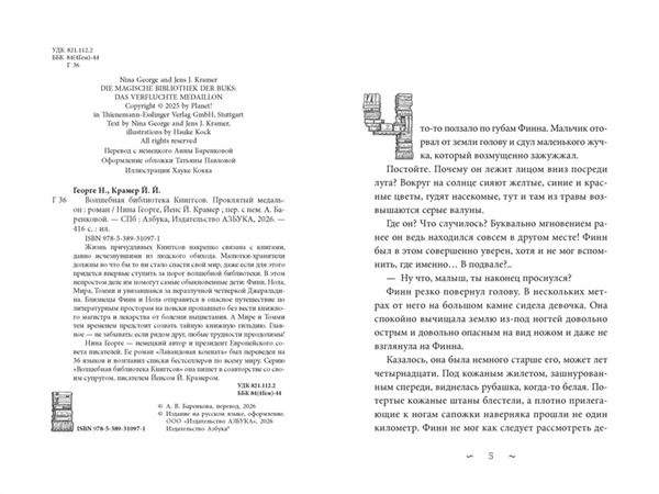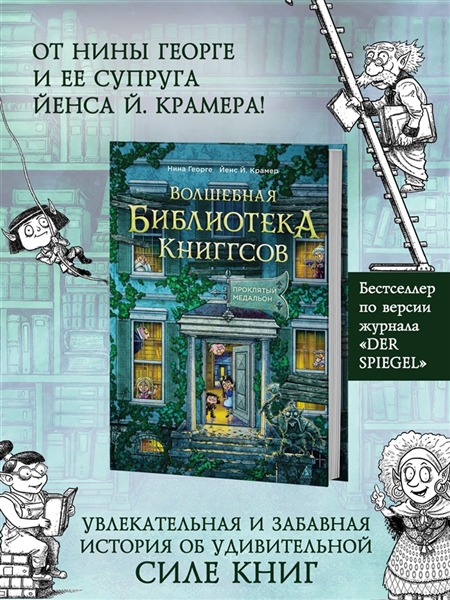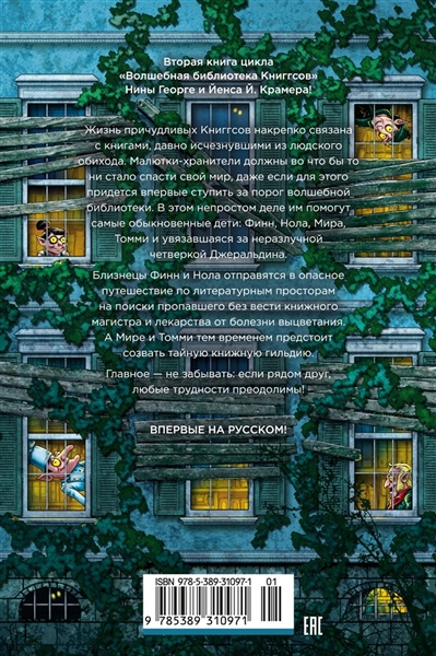 Жизнь причудливых Книггсов накрепко связана с книгами, давно исчезнувшими из людского обихода. Малютки-хранители должны во что бы то ни стало спасти свой мир, даже если для этого придется впервые ступить за порог волшебной библиотеки. В этом непростом деле им помогут самые обыкновенные дети: Финн, Нола, Мира, Томми и увязавшаяся за неразлучной четверкой Джеральдина. Близнецы Финн и Нола отправятся в опасное путешествие по литературным просторам на поиски пропавшего без вести книжного магистра и лекарства от болезни выцветания. А Мире и Томми тем временем предстоит созвать тайную книжную гильдию. Главное — не забывать: если рядом друг, любые трудности преодолимы! Нина Георге — немецкий автор и президент Европейского совета писателей. Ее роман «Лавандовая комната» был переведен на 36 языков и возглавил списки бестселлеров по всему миру. Серию «Волшебная библиотека Книггсов» она пишет в соавторстве со своим супругом, писателем Йенсом Й. Крамером.