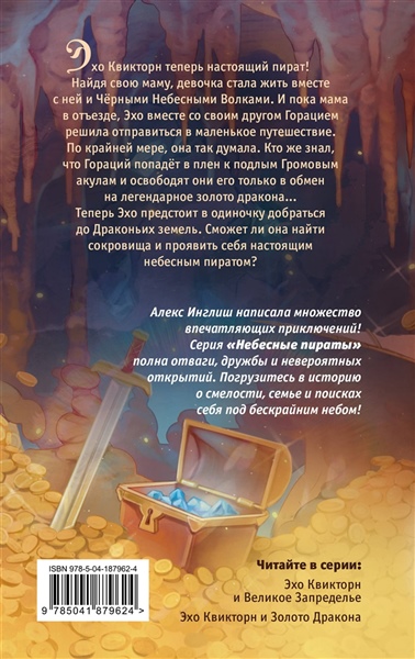 Приготовьтесь к захватывающему приключению в необыкновенном мире! Вас ждут огромные дирижабли, механические драконы и небесные пираты! Финальная книга дилогии. Эхо Квикторн теперь настоящий пират! Найдя свою маму, девочка стала жить вместе с ней и Чёрными Небесными Волками. И, пока мама в отъезде, Эхо вместе со своим другом Горацием решила отправиться в маленькое путешествие. По крайней мере, она так думала. Кто же знал, что Гораций попадет в плен к подлым Громовым акулам и освободят они его только в обмен на легендарное золото дракона… Теперь Эхо предстоит в одиночку добраться до Драконьих земель. Сможет ли она найти сокровища и проявить себя настоящим небесным пиратом? Для читателей от 10 лет.