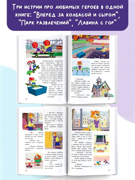 Кот Леопольд отправляет Белого и Серого на поиски сокровищ. Но кто знает, к чему может привести пищащее желание отведать колбаски и сыра?.. Прекрасный день в парке развлечений обернулся Леопольду не только задорнымкатанием на скейте, но и сдутым клоуном, размотанной мумией, беззубым вампироми, конечно,летающими мышами… Что за зимний праздник без колючей зелёной красавицы?! Однако добыть её становится крайне сложно, когда за дело берутся два маленьких мышонка — Белый и Серый. Но даже злодеи способны исправиться под влиянием добрейшего кота Леопольда! Три истории в одной книге!