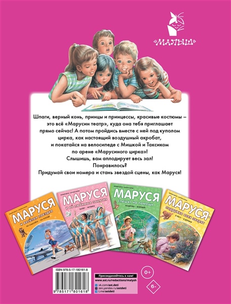 Серия "Приключения Маруси" — это уникальный издательский проект, который стал бестселлером сначала во Франции, а потом в более чем 50 странах мира! В книгу "Маруся — звезда сцены" вошли две весёлые истории про эту знаменитую любознательную девочку и её лучшего друга Таксика. В первой истории дети попадут в "Марусин театр" и узнают, как можно с помощью простых вещей, забытых на чердаке, поставить настоящий спектакль! А во второй — в "Марусин цирк", на арену к настоящим акробатам, львам и клоунам! Книги о Марусе переведены на 30 иностранных языков. А ещё про неё снимают мультфильмы, которые с успехом идут во всём мире. На русский язык книгу пересказала Н. Мавлевич. Для младшего школьного возраста.