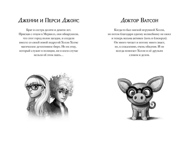 Увлекательный фэнтези-детектив для детей, которые обожают загадки, а также все волшебное! Мервилл — маленький городок, который на первый взгляд, особенно если ты взрослый, совсем ничем не примечателен. Однако Дженни и Перси, сестра и брат, которые переезжают в Мервилл с отцом, уже по дороге туда замечают летающий автомобиль. Можно ли назвать городок обычным, когда видишь подобное? Точно нет! Совсем скоро ребята знакомятся с девочкой по имени Холли Холмс, которая, как она говорит, прапраправнучка того самого сыщика, и погружаются в самое настоящее волшебное детективное расследование, ведь на кону пропавший холодильник, содержащий древнюю китайскую тайну.