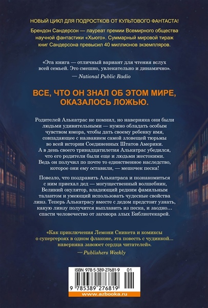 Родителей Алькатрас не помнил, но наверняка они были людьми удивительными — нужно обладать особым чувством юмора, чтобы дать своему ребенку имя, совпадающее с названием самой зловещей тюрьмы во всей истории Соединенных Штатов Америки. А в день своего тринадцатилетия Алькатрас убедился, что его родители были еще и людьми жестокими. Ведь он получил по почте то единственное наследство, что они ему оставили, — мешочек песка! Повезло, что поздравить Алькатраса и познакомиться с ним приехал дед — могущественный волшебник, Великий окулятор, владеющий редким фамильным талантом и умеющий использовать чудесные свойства линз. Теперь Алькатрасу вместе с дедом предстоит узнать, какую линзу получится выплавить из песка, и заодно… спасти человечество от заговора злых Библиотекарей.