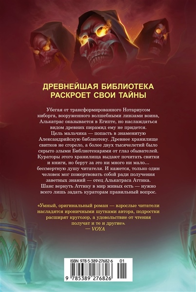 Убегая от трансформированного Нотариусом киборга, вооруженного волшебными линзами воина, Алькатрас оказывается в Египте, но наслаждаться видом древних пирамид ему не придется. Цель мальчика — попасть в знаменитую Александрийскую библиотеку. Древнее хранилище свитков не сгорело, а более двух тысячелетий было скрыто злыми Библиотекарями от глаз обывателей. Кураторы этого хранилища выдают почитать свитки и книги, но берут за это ни много ни мало… бессмертную душу читателя. И кажется, только один человек мог пожертвовать собой ради получения заветных знаний — отец Алькатраса Аттика. Шанс вернуть Аттику в мир живых есть — нужно всего лишь задать кураторам правильный вопрос.