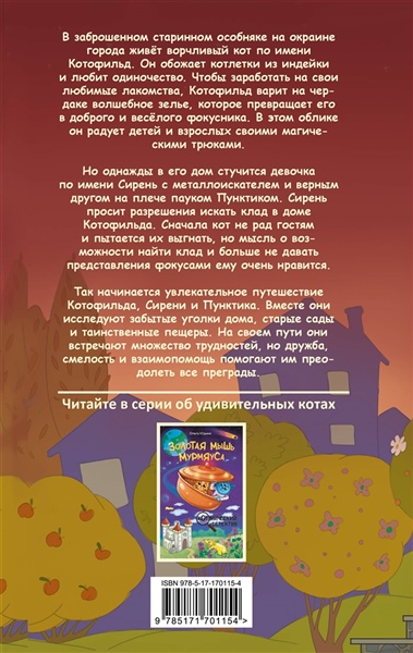 В заброшенном старинном особняке на окраинегорода живёт ворчливый кот по имениКотофильд. Он обожает котлетки из индейкии любит одиночество. Чтобы заработать на своилюбимые лакомства, Котофильд варит на чердаке волшебное зелье, которое превращает егов доброго и весёлого фокусника. В этом облике он радует детей и взрослых своими магическими трюками. Но однажды в его дом стучится девочкапо имени Сирень с металлоискателем и верным другом на плече пауком Пунктиком. Сирень просит разрешения искать клад в доме Котофильда. Сначала кот не рад гостям и пытается их выгнать, но мысль о возможности найти клад и больше не давать представления фокусами ему очень нравится.Так начинается увлекательное путешествие Котофильда, Сирени и Пунктика. Вместе они исследуют забытые уголки дома, старые сады и таинственные пещеры. На своем пути они встречают множество трудностей, но дружба, смелость и взаимопомощь помогают им преодолеть все преграды.