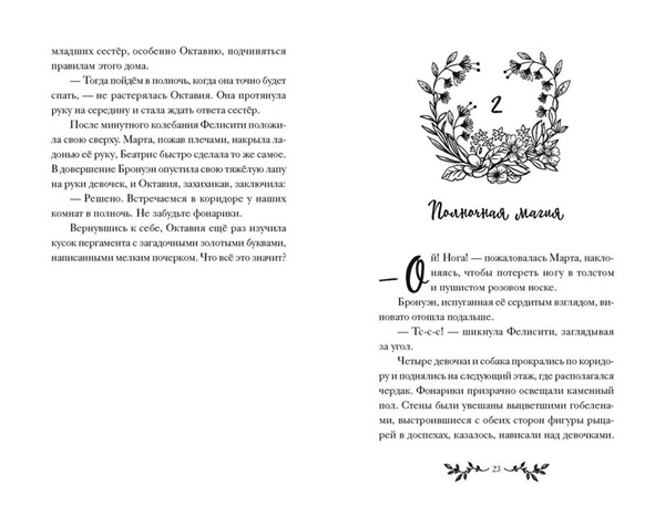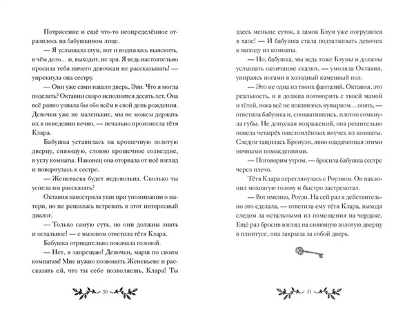 Первая часть захватывающей истории о магических существах, семейных тайнах и четырёх смелых сёстрах! Октавии почти 10 лет, и она жаждет веселья и приключений. Она проводит каникулы в доме у бабушки, играя с сестрой Фелисити и кузинами Беатрис и Мартой. Однажды во время пряток девочка решает спрятаться на чердаке. Её находит Фелисити и призывает спуститься вниз, ведь бабушка запретила им там находиться. Они уже собираются уходить, когда замечают маленькую дверь. По другую сторону девочек Блум ждут могущественные феи, дружелюбные единороги и говорящие животные. Но сначала нужно найти ключ… В книге поднимаются такие важные темы, как взаимоотношения сестёр, уверенность в себе, храбрость и принятие сложных решений. Порадует фанатов таких культовых фэнтези-произведений, как «Хроники Нарнии» и «Таинственный сад».