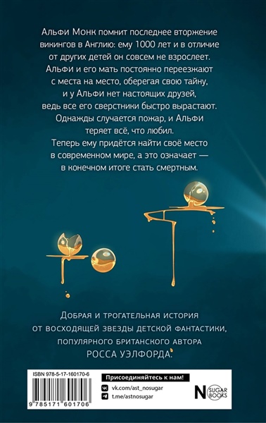 Альфи Монк помнит последнее вторжение викингов в Англию: ему 1000 лет, и, в отличие от других детей, он совсем не взрослеет. Альфи и его мать постоянно переезжают с места на место, оберегая свою тайну, и у Альфи нет настоящих друзей, ведь все его сверстники быстро вырастают. Однажды случается пожар, и Альфи теряет всё, что любил. Теперь ему придётся найти своё место в современном мире, а это означает — в конечном итоге стать смертным. Добрая и трогательная история от популярного британского автора, звезды подростковой фантастики Росса Уэлфорда.