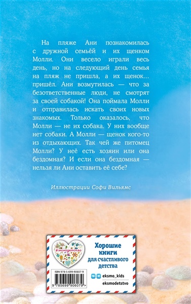 На пляже Ани познакомилась с дружной семьей и их щенком Молли. Они весело играли весь день, но на следующий день семья на пляж не пришла, а их щенок… пришел. Ани возмутилась – что за безответственные люди, не смотрят за своей собакой! Она поймала Молли и отправилась искать своих новых знакомых. Только оказалось, что Молли – не их собака. У них вообще нет собаки. А Молли – щенок кого-то из отдыхающих. Так чей же питомец Молли? У нее есть хозяин или она бездомная? И если она бездомная – нельзя ли Ани оставить ее себе?