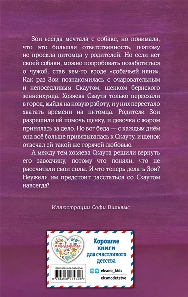 Зои всегда знала, что щенок – это очень и очень большая ответственность. Поэтому хоть она и мечтала о щенке, но не торопилась просить его у родителей. Однажды девочка познакомилась со Скаутом, щенком бернского зенненхунда, длиннолапым, непоседливым и очень дружелюбным. Хозяева Скаута недавно переехали в город, у них новая работа, и они не могли уделять щенку столько внимания, сколько нужно, отчего он начал проказничать. Зои вызвалась помочь – гулять с малышом, играть, дрессировать. Только с каждым днём она всё больше привязывалась к мохнатому ученику. Хозяева Скаута решили, что не рассчитали свои силы и решили вернуть щенка заводчику. Значит, Зои и Скауту предстоит разлука?..