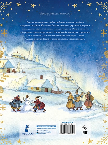 Одна из самых уютных и весёлых повестей Н.В. Гоголя. Всё в ней проникнуто рождественским духом, праздничным настроением, несмотря на то что читатель найдёт здесь множество представителей нечистой силы. Но главный герой кузнец Вакула чист душой, а потому сумеет использовать их для доброго дела. Радостные, яркие иллюстрации И.Петелиной. Для среднего школьного возраста.
