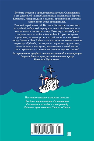 Весёлые повести о приключениях матроса Солнышкина и его друзей, об их необыкновенных плаваниях к берегам Камчатки, Антарктиды и к далёким тропическим островам автор писал более тридцати лет. Главный герой повестей Виталия Коржикова — мальчик из далёкой сибирской деревушки Алексей Солнышкин — всегда мечтал посмотреть мир. Поэтому, когда бабушка отправила его из тайги в ближайший город поступать в училище, мальчик уехал на край земли — в портовый город Океанск. Там оказалось, что в морское училище Солнышкин не годен — мал ещё, надо подрасти! Зато он попал матросом на пароход «Даёшь!». Жаль только, что капитан судна оказался отъявленным разгильдяем. На любой вопрос у него был один ответ: «Плавали — знаем!» С таким командиром немудрено сесть на мель. Однако юному искателю приключений любые трудности по плечу, ведь именно к такой жизни он и стремился — к жизни настоящего морского волка!