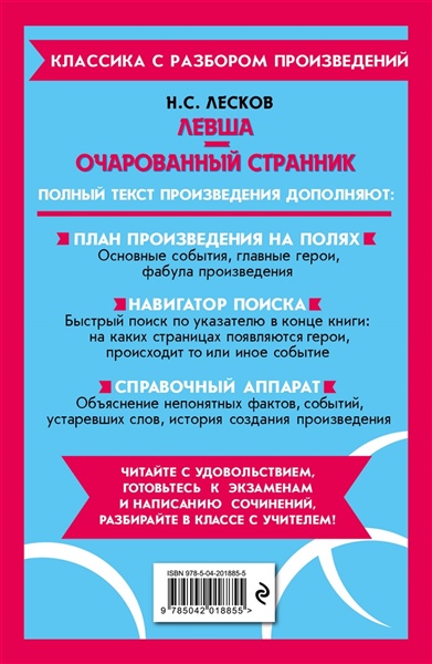 Н. С. Лесков — уникальный писатель, который в своих произведениях сумел раскрыть перед читателями всю глубину русской души. Яркими примерами его творчества являются повести «Левша» и «Очарованный странник», которые до сих пор пользуются большой популярностью как среди школьников, так и среди старших поколений. Новое издание этих произведений станет незаменимым помощником в подготовке к ЕГЭ, ОГЭ и урокам литературы. В нем вы найдете уникальные справочные материалы: заметки на полях для быстрого поиска нужного фрагмента, развернутые комментарии, где объясняются устаревшие слова и непонятные факты, историю создания произведений, указатель имен и событий. Все это поможет не только быстро и легко подготовиться к экзаменам, но и узнать новые факты, которые можно было упустить на уроке. В «Левше» рассказывается об одаренном умельце, простом тульском мастере, который смог подковать крошечную металлическую блоху, превзойдя тем самым английских мастеров. Повесть высмеивает гордость и превосходство высшего класса, показывая, что простой русский человек может быть не менее талантливым и изобретательным. «Очарованный странник» — повесть, которая знакомит читателя с добрым и простодушным монахом с внешностью былинного богатыря Иваном Флягиным. В ходе путешествия на пароходе он рассказывает своим попутчикам, сколько приключений, мук и испытаний он пережил, прежде чем покаялся и пришел к Богу.