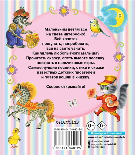 Маленьким детям от года до трёх лет столько всего предстоит освоить. Научиться ходить, говорить и, конечно, познакомиться с книгами. В сборник "Читаем малышу от 1 года до 3 лет" вошли русские народные песенки и песенки разных народов, пальчиковые игры, стихи, русские народные и авторские сказки. Стихи и сказки написали классики детской литературы и современные писатели и поэты – С. Маршак, С. Михалков, Е. Григорьева, Анастасия Орлова и многие другие. Вместе с книжкой можно не только интересно провести время, но и развить речь, воображение и чувство юмора. Для детей до 3-х лет.