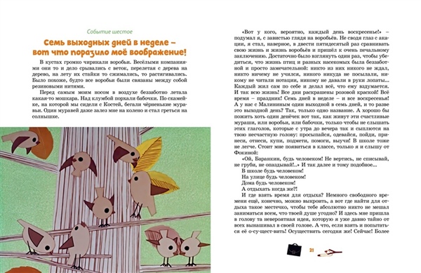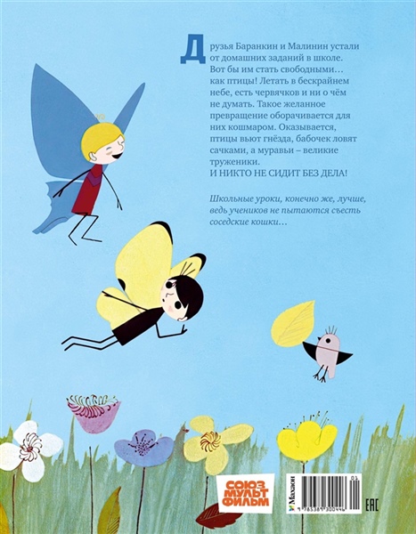 Друзья Баранкин и Малинин устали от домашних заданий в школе. Вот бы им стать свободными… как птицы! Летать в бескрайнем небе, есть червячков и ни о чём не думать. Такое желанное превращение оборачивается для них кошмаром. Оказывается, птицы вьют гнёзда, бабочек ловят сачками, а муравьи – великие