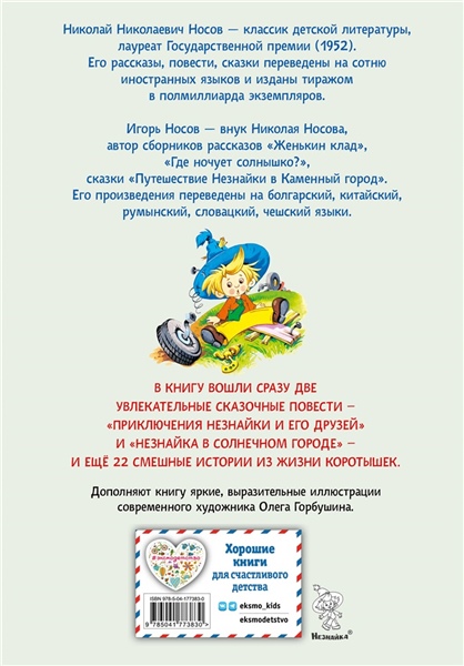 Прекрасный подарок юным читателям — две увлекательнейшие сказочные повести Николая Николаевича Носова и 22 весёлых рассказа Игоря Петровича Носова о жизни коротышек из Цветочного города!
