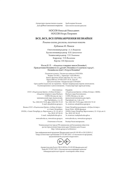 «Все,все,все приключения Незнайки» — это большая книга произведений Николая Носова и его внука Игоря Носова, в которой собраны все истории о любопытном коротышке Незнайке и его друзьях. В мире малышей и малышек, кажется, можно абсолютно всё: стать художником и музыкантом, покататься на автомобиле, заправленном газировкой, полетать на воздушном шаре и даже отправиться на Луну! Обаятельные сказки о весёлых героях наполнены невероятным оптимизмом, они учат детей совершать хорошие поступки, быть отзывчивыми и трудолюбивыми.