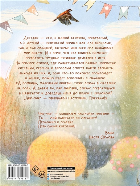 Можно ли превратить трудные рутинные действия в игру? Конечно! Особенно если под рукой окажется этот сборник стихотворений Анастасии Орловой. "Львёнок в магазине", "Котёнок в самолёте", "Слонёнок в посудной лавке" и другие стихотворения о зверятах в разных бытовых ситуациях ждут вас на страницах этой книжки. А ещё игры и задания, которые помогут отвлечь и развлечь детей, если вы, например, сидите с ними в очереди в поликлинике, гуляете, оказались в дороге и т. д.