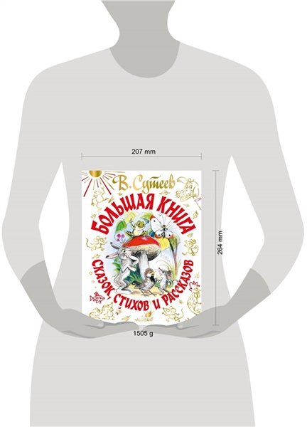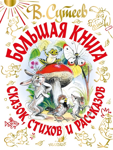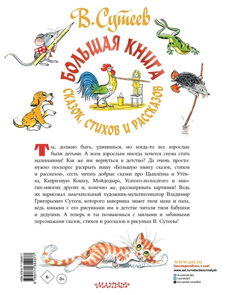 "Большая книга В. Сутеева" – это сборник сказок и стихотворений в рисунках известного художника-мультипликатора, любимца бабушек и мам, Владимира Григорьевича Сутеева. В книгу вошли произведения российских и зарубежных писателей и поэтов: А. Барто, С. Михалкова, К. Чуковского, А. Прёйсна, Л. Муур, С. Мурадяна и других. Также в сборник включены сказки самого В. Сутеева, которые входили в его наиболее известный, неоднократно переизданный сборник – "Сказки и картинки". Особенно примечательна наша книга тем, что в ней впервые после долгого перерыва публикуются иллюстрации В. Сутеева к циклу стихотворений А. Барто "Вовка – добрая душа", к стихам В. Орлова "Однажды" и "Рецепт", а также "Ёжик-портняжка" и "Уточка и дудочка" Е. Каргановой.