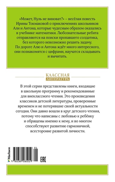 «Может, Нуль не виноват?» – весёлая повесть Ирины Токмаковой о приключениях школьников Али и Антона, которые чудесным образом оказались в учебнике математики. Любознательные ребята отправляются на поиски пропавшего солдатика, без которого невозможно решить задачу. По дороге Алю и Антона ждёт много интересного, они познакомятся с цифрами, научатся складывать и вычитать.