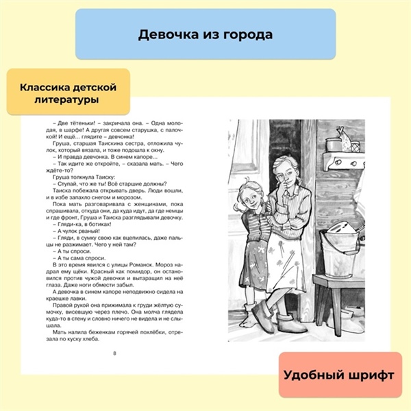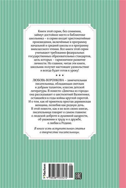 Любовь Фёдоровна Воронкова – классик детской литературы, замечательная детская писательница, обладающая светлым и добрым талантом. Она писала для всех возрастов – от «Маши-растеряши» для малышей до исторических произведений о походах Александра Македонского, адресованных подросткам. Простая и удивительно трогательная повесть «Девочка из города» рассказывает о шестилетней Валентинке, оставшейся в годы войны сиротой. И о том, как она нашла новую семью в доме простой деревенской женщины, полюбившей её как родную дочь.
