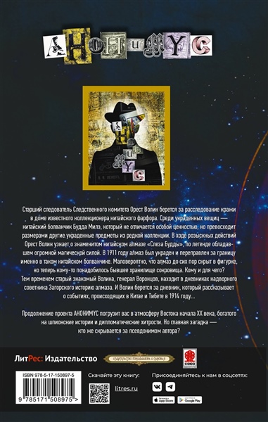 Тем временем старый знакомый Волина, генерал Воронцов, находит в дневниках надворного советника Загорского историю алмаза. И Волин берется за дневник, который рассказывает о событиях, происходящих в Китае и Тибете в 1914 году...Продолжение проекта AНОНИМYС погрузит вас в атмосферу Востока начала ХХ века, богатого на шпионские истории и дипломатические хитрости. Но главная загадка — кто же скрывается за псевдонимом автора?