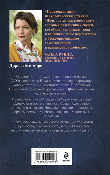 Специалист по романтической поэзии начала XIX в. аспирантка Ника соглашается на подработку литсекретарем у знаменитого поэта. Поэт вводит Нику в свой домашний круг на даче у Финского залива и… внезапно умирает. Несчастный случай?Сердечный приступ? Суицид? Однако сын поэта от первого брака подозревает убийство и нанимает Нику: официально разобрать архивы покойного. Неофициально — докопаться до истины.Но что, если каждый из членов семьи имеет и мотив для убийства, и возможность? А сама Ника вовсе не случайно появилась на старой фамильной даче?.. Детективы Дарьи Дезомбре отличает наличие тонкой интриги, мистических тайн и детального экскурса в историю, культуру и искусство. Над каждой новой книгой Дезомбре работает кропотливо. Воссоздавая прошлое, она читает мемуары, проводит много часов в библиотеках и музеях, собирает фотографии одежды и предметов прошлых эпох из семейных альбомов, журналов.